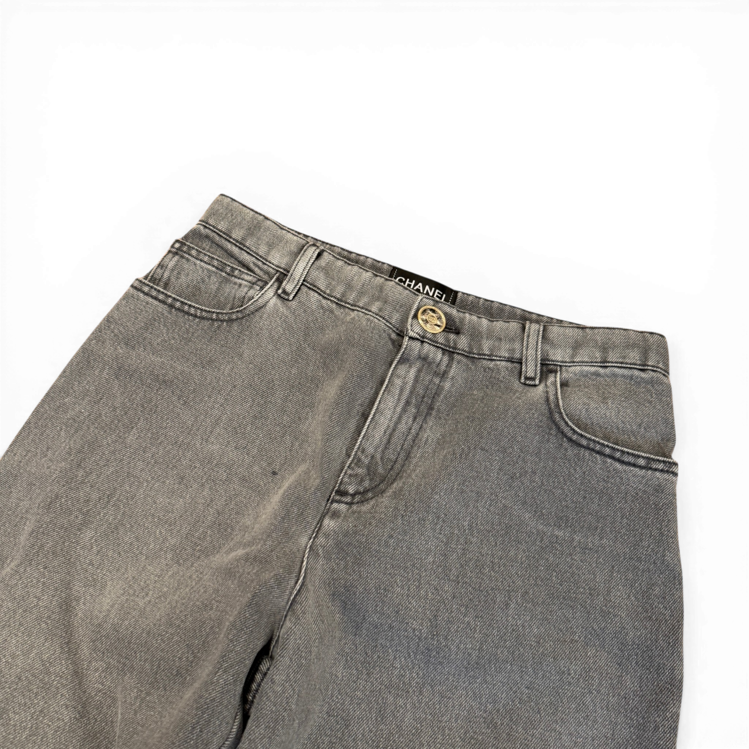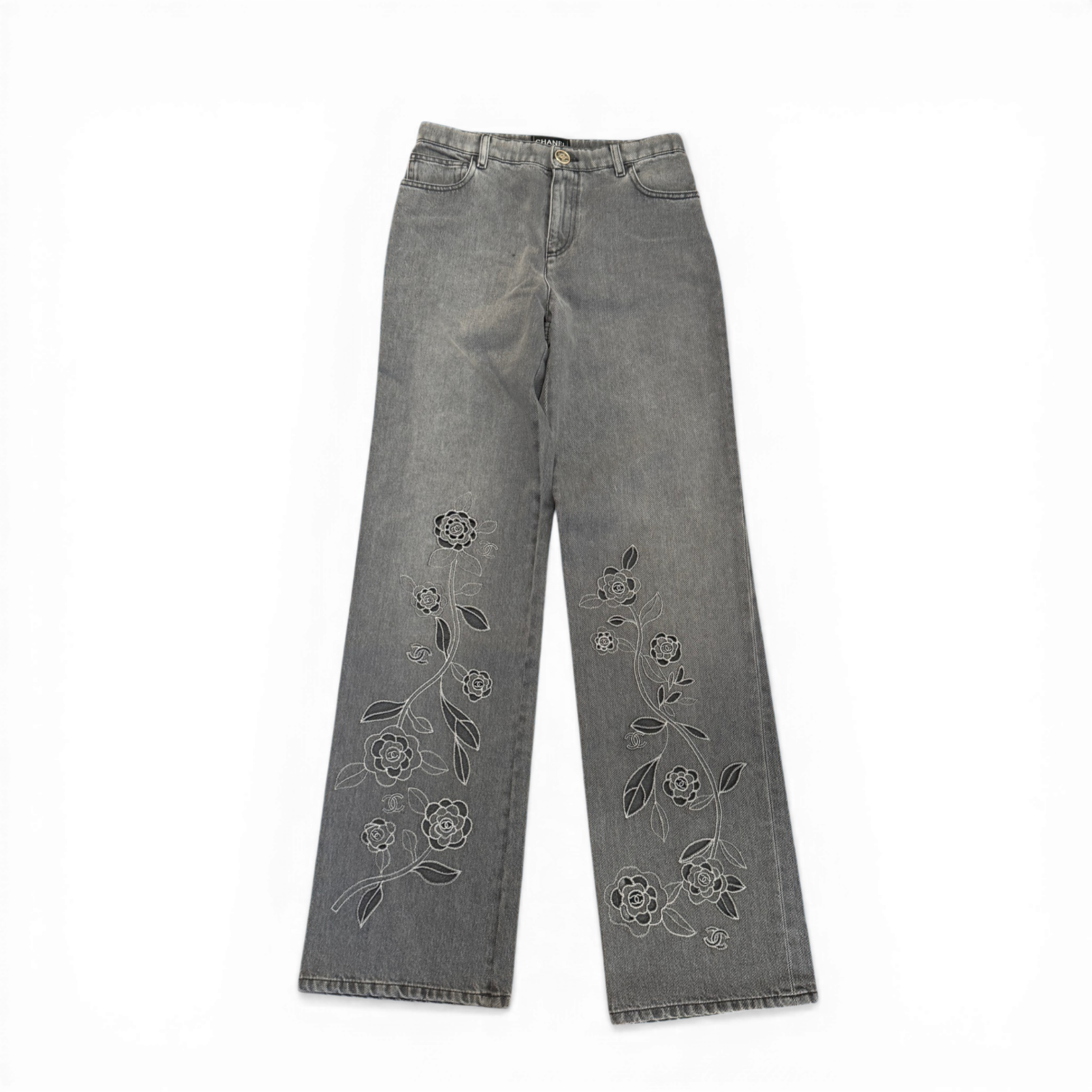 Chanel SS24 Embroidered Floral Cut Out Flared Grey Denim Sample