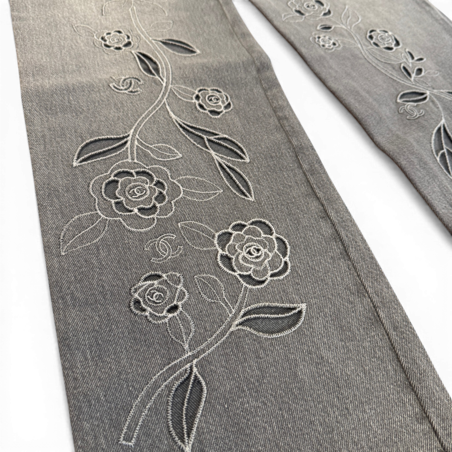Chanel SS2024 Embroidered Floral Cut Out Flared Grey Denim Sample